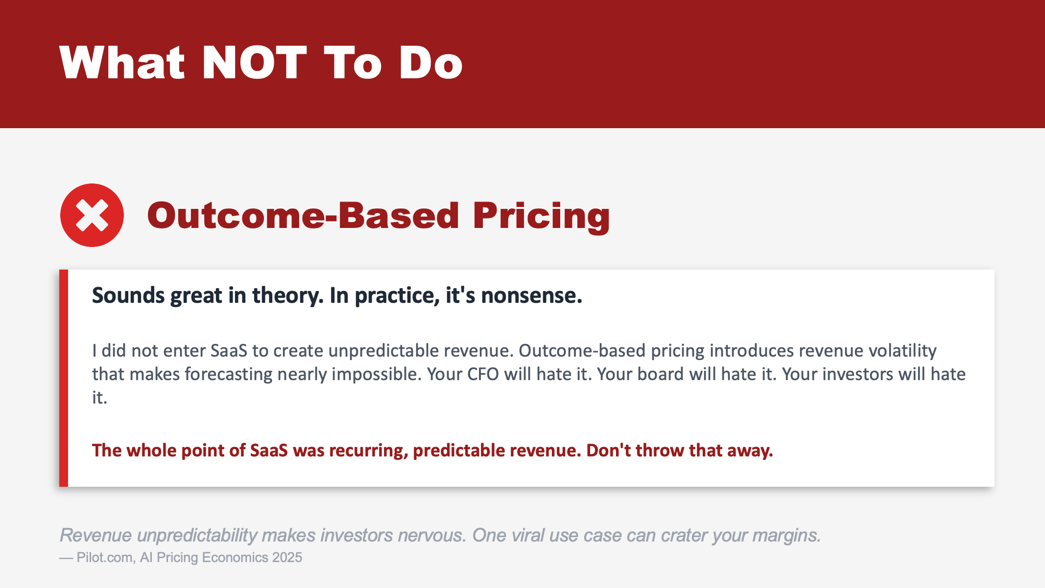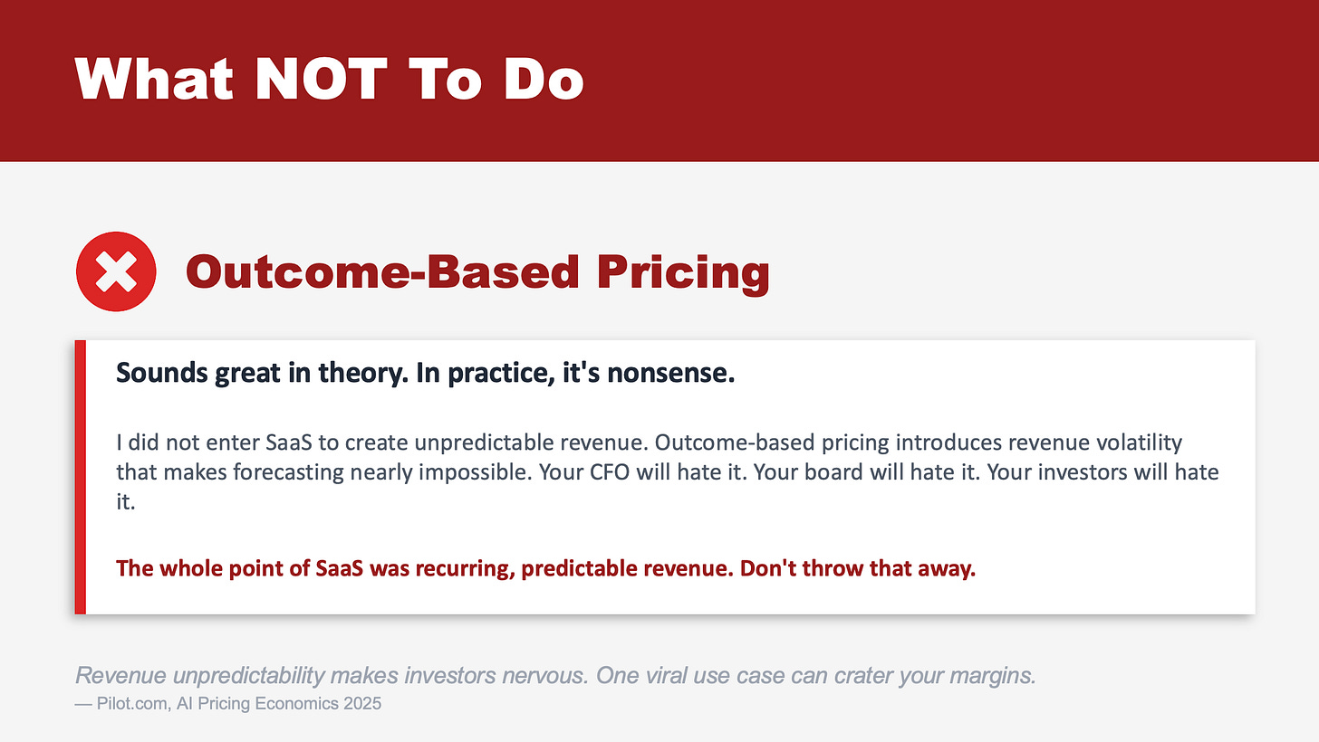 The whole point of SaaS was recurring, predictable revenue. Don’t throw that away chasing a pricing model that introduces volatility you can’t control.