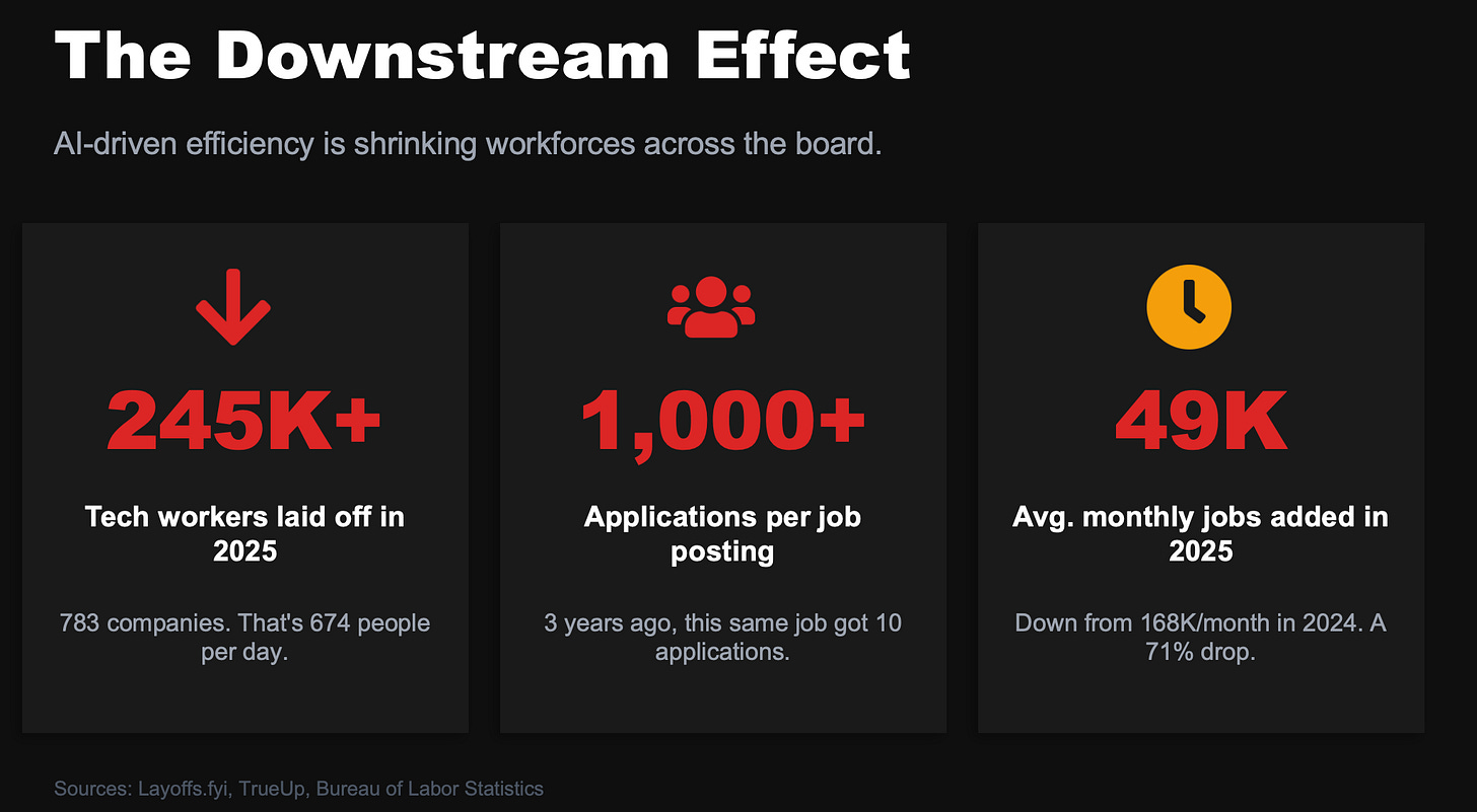 Even if half these claims are exaggerated, the result is the same. Companies need fewer people to do the same work. And the market isn’t growing fast enough to compensate.