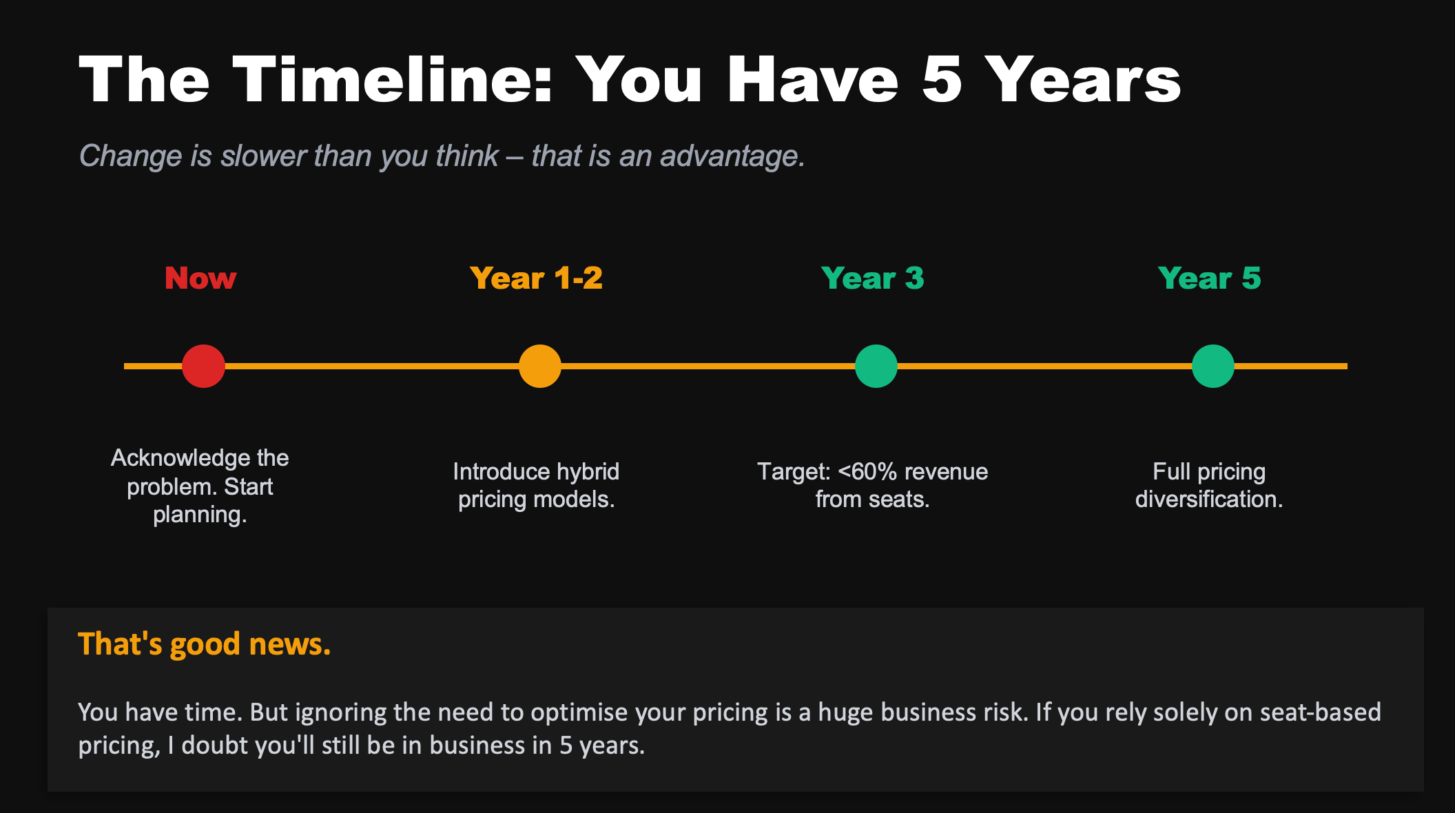 Your target: within three years, less than 60% of your revenue should come from seats.