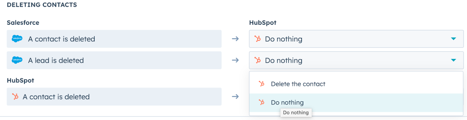 You can set up what is going to happen in each platform when a record gets deleted. The options are: do nothing or delete the record.