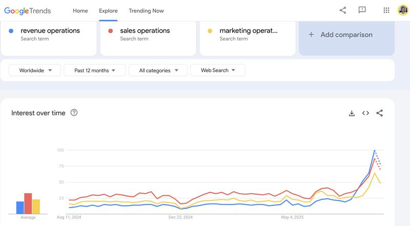 Revenue Operations is no longer a niche term. The latest Google Trends data shows that for the first time, “Revenue Operations” has outpaced searches for both “Sales Operations” and “Marketing Operations.” Over the past 30 days it has consistently stayed on top.