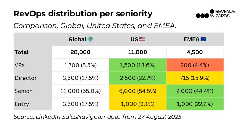 But the momentum is shifting. In 2023 there were around 3,000 RevOps professionals in EMEA. By 2025, that number has grown to 4,500. It’s the fastest-growing RevOps market worldwide. The VP gap will close.
