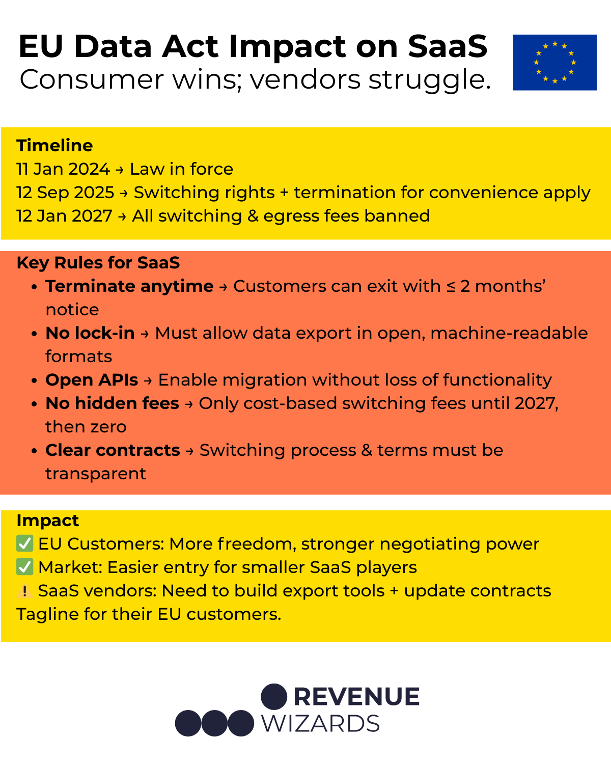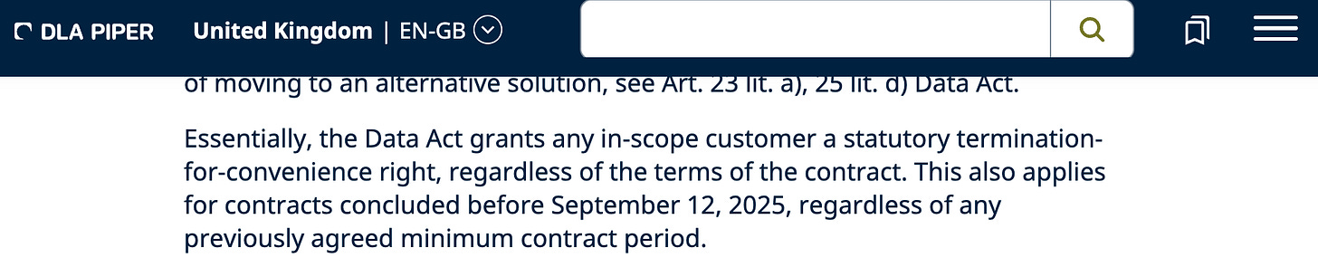 From 12 September 2025 the EU Data Act has flipped the script for SaaS contracts in the European Union. Customers can now cancel almost any cloud subscription at any time, for any reason. Salesforce, Miro, ServiceNow. Just wild.