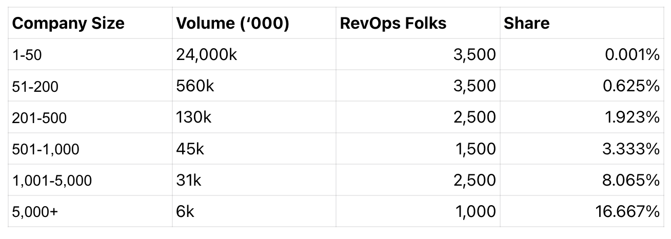 Still, we can conclude that larger enterprises have relatively more RevOps professionals than smaller companies.