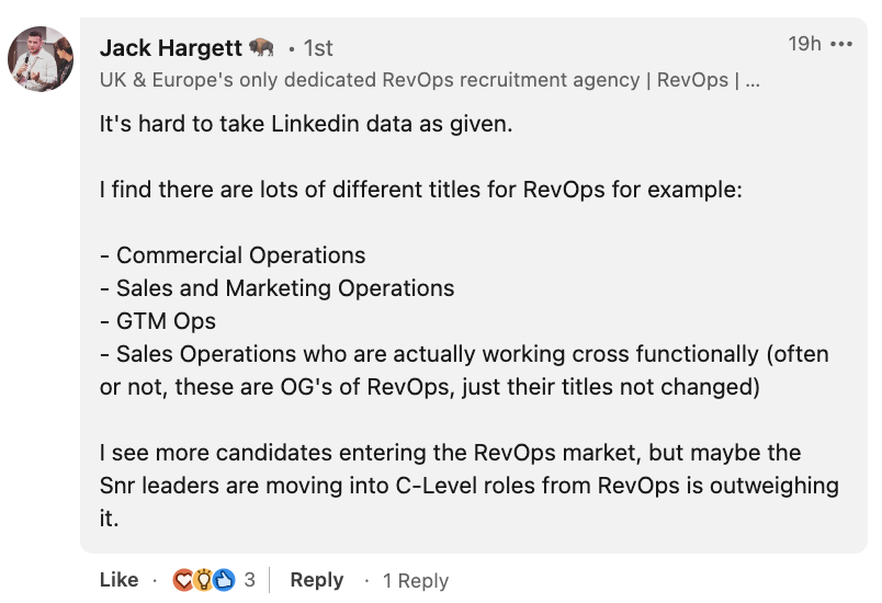 Before writing this blog, I shared the data on LinkedIn without much explanation to see how the RevOps community would interpret it. One recurring point was the number of GTM titles.
